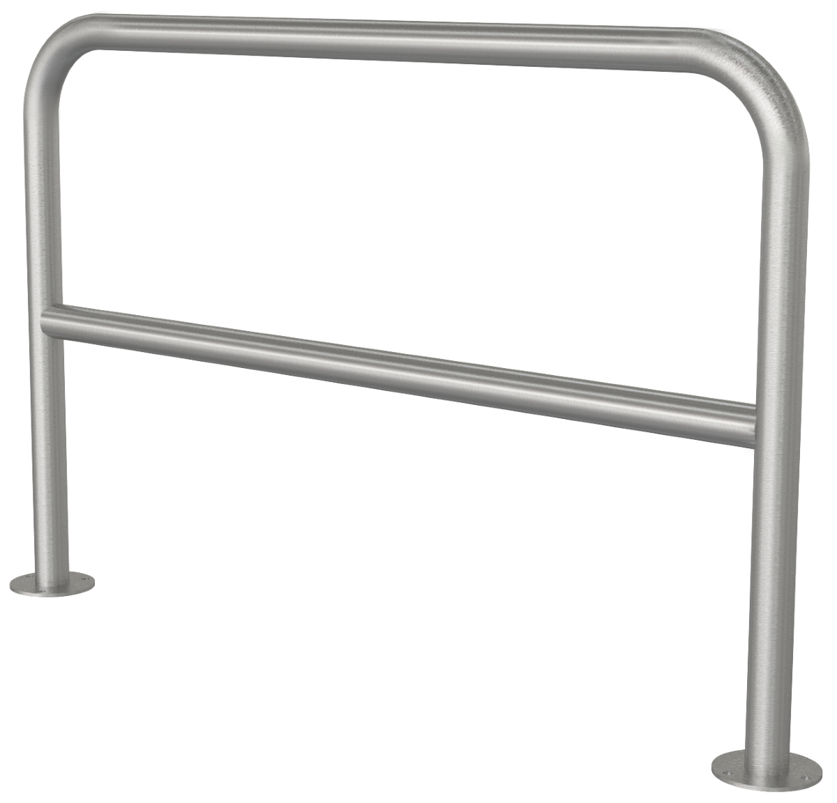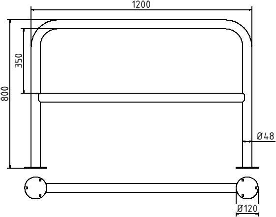 Edelstahlbügel Ø48 mm, mit QuerholmnLänge: 1200 mm, Gesamthöhe: 800 mmnmit Bodenplatte zum Aufdübeln