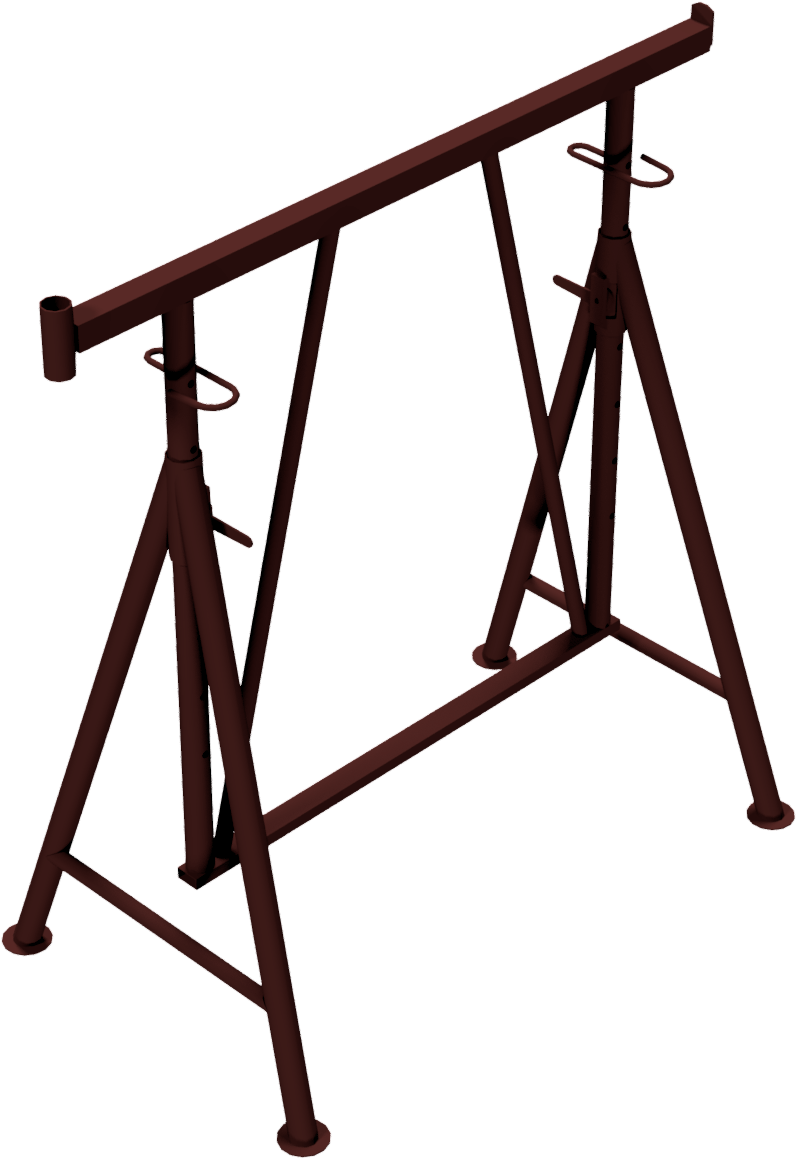 Die Standfüße des Gerüsts (Ø 42 mm Rundrohr) sind drehbar und mit zwei Grundplatten versehen, die eine standfeste Positionierung auf jedem Untergrund ermöglichen. Zudem ist das Obergestell des Gerüstbocks mit einer Traverse ausgestattet, die ausziehbar ist und in mehreren Stufen mit einem unverlierbaren Haken einstellbar ist.