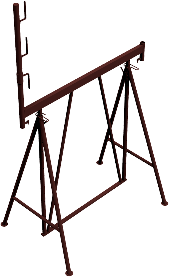 Die beiden Standfüße, gefertigt aus Ø 42 mm Rundrohr, sind drehbar und besitzen jeweils 2 Grundplatten. Diese ermöglichen eine standfeste Positionierung auf jedem Untergrund. Das Obergestell mit Traverse ist ausziehbar und in mehreren Stufen mittels eines unverlierbaren Hakens einstellbar.