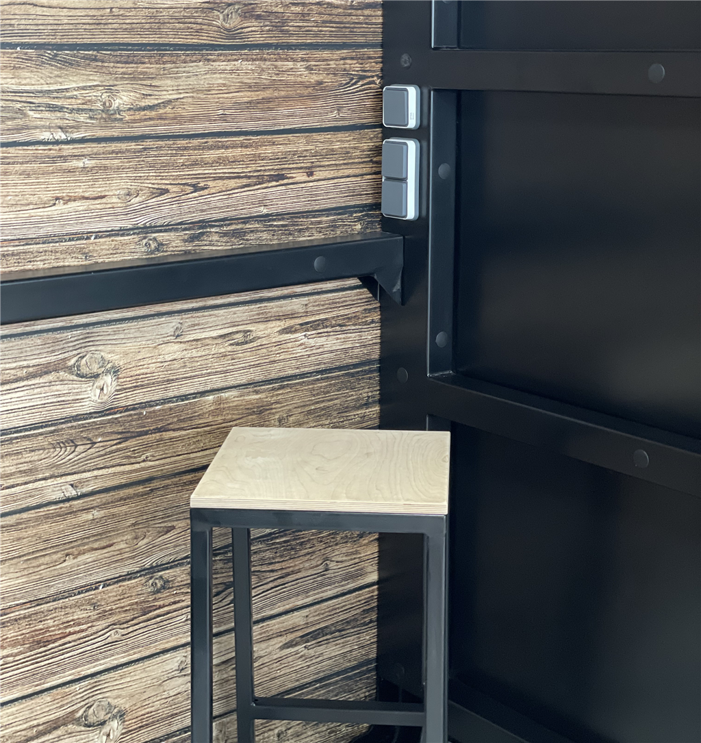 Die Abmessungen betragen 2000x2000x2410mm bei einem Gewicht von 1510kg. Sie kommt inklusive einer bedruckbaren Aluverbundplatte als Rückwand, drei Barhockern, einem Desinfektionsspender, einem Aschenbecher, einem CEE-Stecker, einem LED-Panel sowie Schuko-Steckdosen. Ihr Design und ihre Funktionen machen sie zu einem idealen Ort für kurze Pausen und informelle Meetings.